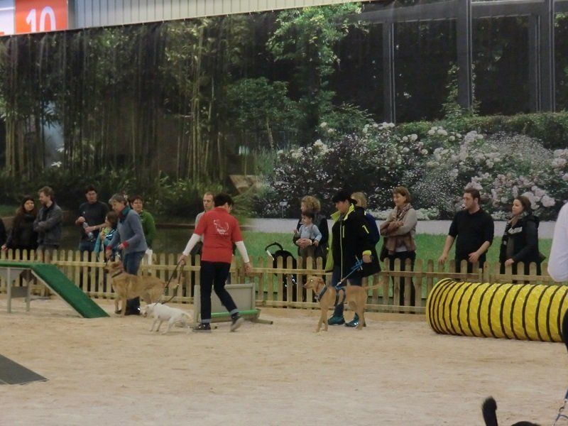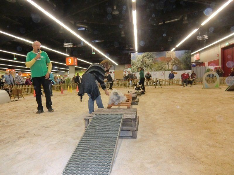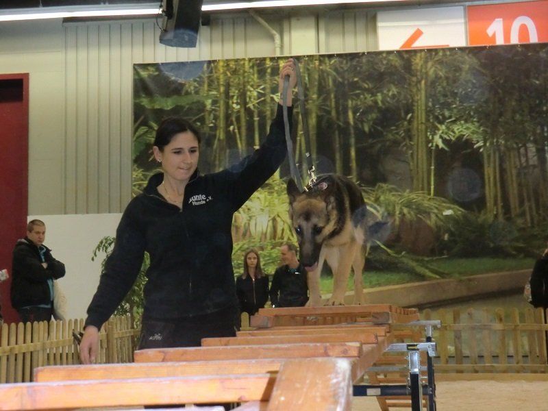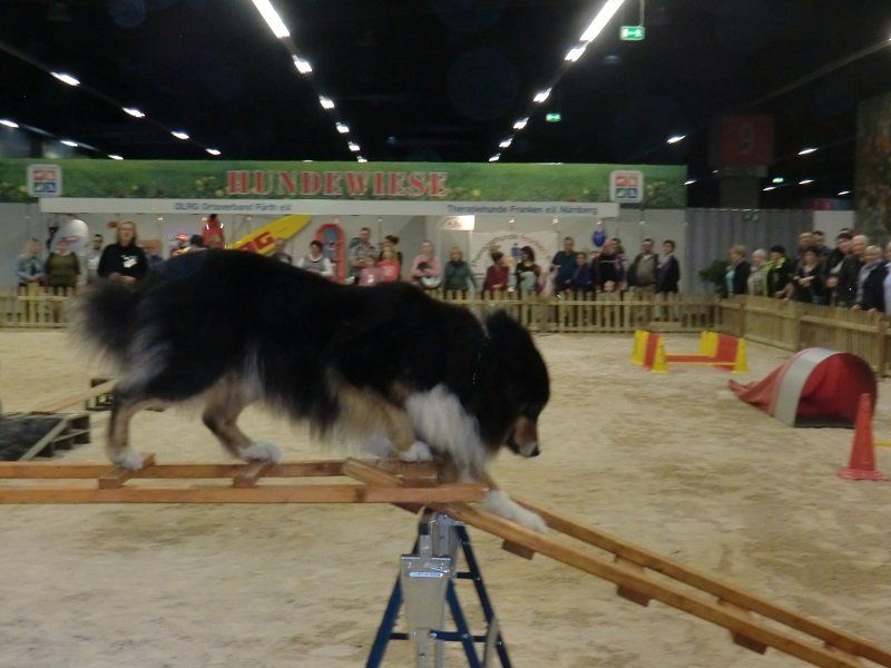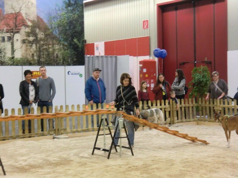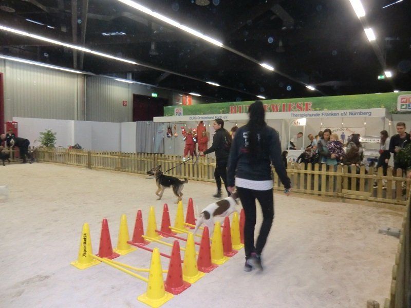 Ein ganz besonderes Interesse fanden die Vorführungen auf einem großen Sandplatz, der in unmittelbarer Nähe unseres Standes angelegt war. Zweimal pro Tag konnten wir dort zeigen, wie wir uns mit unseren Vierbeinern beschäftigen – und was diese Hunde alles leisten können. Bei einer Vorführung stand Gehorsam im Mittelpunkt, bei der anderen Fungility. Die zahlreichen Besucherhunde waren eingeladen, mitzumachen. Vielleicht hat dem einen oder anderen dies so viel Spaß gemacht, dass er (oder sie) uns in Oberasbach besuchen wird.