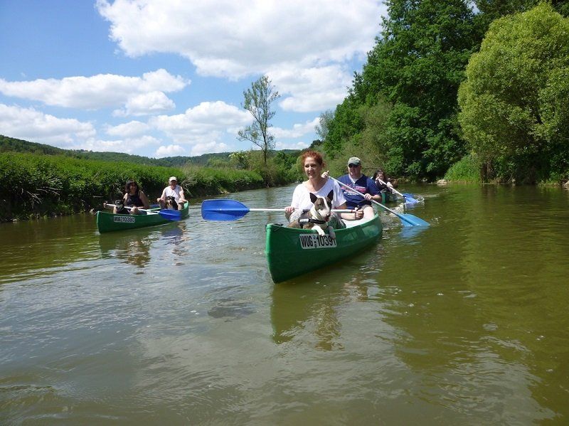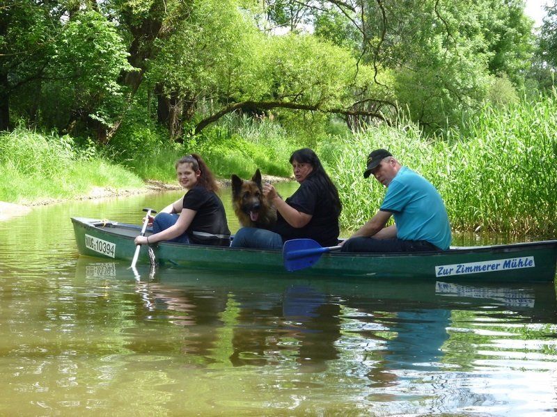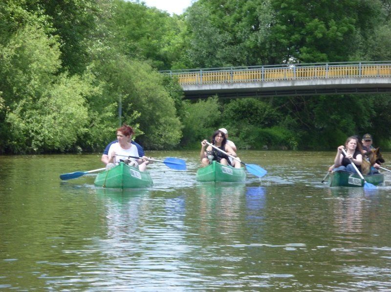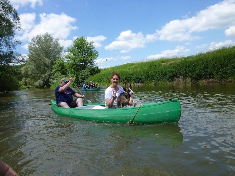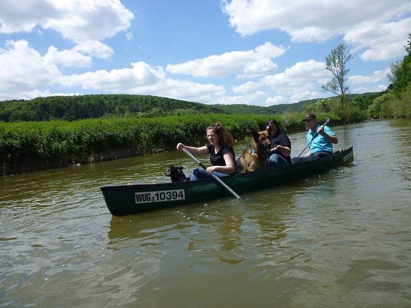 Bei strahlendem Sonnenschein fuhren dann alle zum Bootsverleih nach Zimmern, wo die mehrstündige Kanu-Fahrt begann. 12 Kilometer wurden auf der Altmühl zurückgelegt, aufgelockert durch kurze Pausen. Die zweimalige Überquerung der Wehre war eine tolle, wenn auch etwas feuchte Erfahrung. Auch den Hunden machte die Fahrt auf den vier Booten sichtlich Spaß. Einem von ihnen, Rex, sogar so sehr, dass er kurz entschlossen zur Abkühlung ins Wasser sprang. Er wurde aber schnell wieder eingefischt – und schon ging es weiter.
